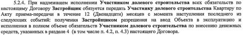 Изучая договор долевого участия, мы часто сталкиваемся с такой формулировкой. Это первый лист договора, из пункта 1.4. дольщик узнает, что срок ввода объекта в эксплуатацию — 31.03.2017 г., при этом он убежден, что квартиру должен получить именно 31 марта. Это заблуждение, в пункте 1.4. указан планируемый срок ввода объекта в эксплуатацию, но никак не срок передачи квартиры. А настоящий срок передачи квартиры указан в пункте 5.2.4. и сформулирован следующим образом: